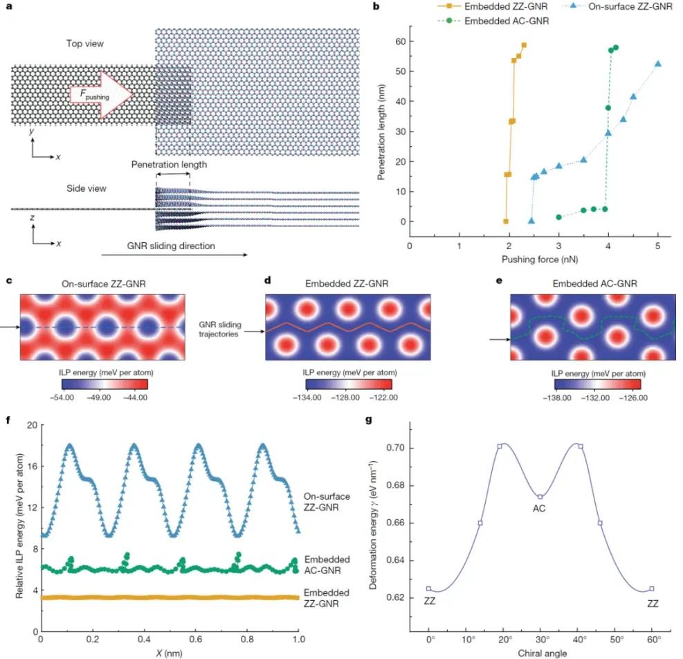 為了揭示六方氮化硼層間超長zigzag石墨烯納米帶的生長機理,聯(lián)合團隊密切合作,發(fā)現(xiàn)石墨烯納米帶在hBN層間的摩擦力顯著小于在其表面的摩擦力,這解釋了hBN層間生長的納米帶長度遠超以往在hBN表面生長結(jié)果的反直覺現(xiàn)象。相對于其他手性的納米帶,zigzag納米帶可以在層間進行近乎無摩擦的滑動,最終導(dǎo)致了石墨烯納米帶的手性選擇性生長。基于石墨烯納米帶在多層hBN中插層所需要克服的能壘以及石墨烯納米帶插入hBN所造成的彈性形變,研究人員估算出了石墨烯納米帶寬度的上限與下限,理論結(jié)果跟實驗測量一致,解釋了超窄石墨烯納米帶的生長機制。