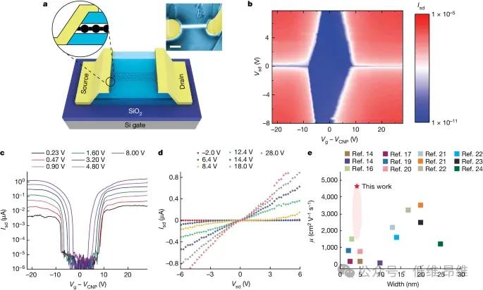 由于所生長的石墨烯納米帶被絕緣hBN“原位封裝”,免受器件加工過程中雜質(zhì)吸附、氧化、環(huán)境污染和光刻膠接觸的影響,所以理論上可獲得極高性能納米帶電子器件。研究人員基于層間生長的納米帶制備了場效應(yīng)晶體管(FET)器件,測量結(jié)果表明,石墨烯納米帶FETs都表現(xiàn)出典型的半導(dǎo)體器件的電學(xué)輸運特性,室溫下的開關(guān)比可達106。更值得關(guān)注的是,器件的載流子遷移率高達4,600 cm2V–1s–1,顯著超越以往報道的所有結(jié)果。