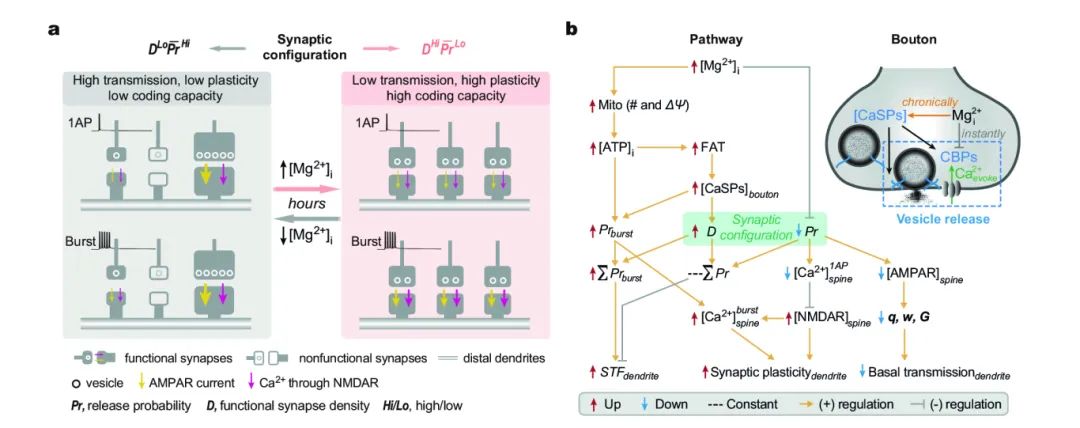 在機理上,研究團隊首次發(fā)現(xiàn)細胞內(nèi)Mg2+是決定突觸構(gòu)象的關(guān)鍵內(nèi)源性分子,并詳細闡明了其背后的分子通路。上調(diào)細胞內(nèi)Mg2+水平,能夠在樹突分枝上增加突觸數(shù)量、減小突觸傳遞強度、增加突觸可塑性和編碼容量;反之,下調(diào)Mg2+水平,則會減少突觸數(shù)量、增加突觸傳遞強度、減小突觸可塑性和編碼容量,從而實現(xiàn)單一內(nèi)源性因子對樹突分枝計算特性的調(diào)控。