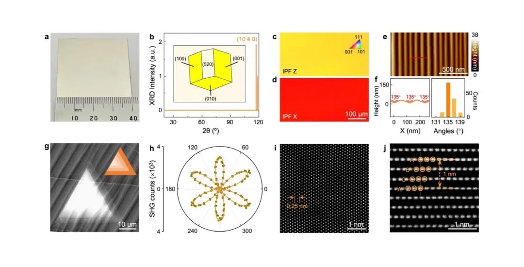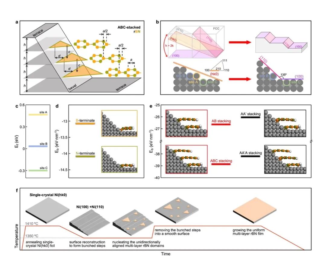 作者在本研究中提出了利用在高指數(shù)單晶金屬Ni表面產(chǎn)生的高臺階來實(shí)現(xiàn)具有ABC堆垛的多層h-BN單晶的方案。在具體實(shí)驗(yàn)中,研究者通過在降溫過程在大尺寸單晶Ni襯底表面形成了沿<110>方向的斜面高臺階并利用臺階的特殊傾斜角鎖定多層h-BN的ABC堆垛模式,從而在臺階處誘導(dǎo)ABC堆垛的h-BN的形核長大,最終制備了英寸級具有ABC堆垛的多層菱方氮化硼單晶。