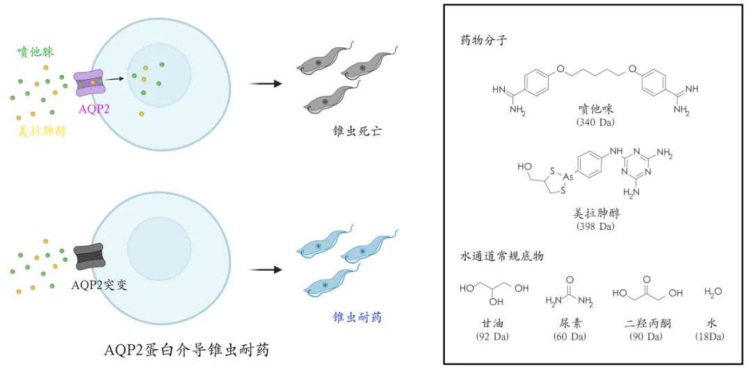 布氏錐蟲(Trypanosome)是引起人類昏睡病和動(dòng)物錐蟲病的病原微生物。噴他脒(pentamidine)和美拉砷醇(melarsoprol)作為錐蟲病的治療藥物已有超過70年的歷史,并且目前仍在使用。與大多數(shù)藥物不同,噴他脒并非通過抑制錐蟲體內(nèi)特定蛋白靶點(diǎn),而是通過結(jié)合DNA來抑制復(fù)制和翻譯過程來達(dá)到殺蟲作用。因此,只有藥物在錐蟲體內(nèi)積累到幾個(gè)毫摩爾的濃度才能起到殺蟲作用。錐蟲水通道AQP2(TbAQP2)對(duì)噴他脒和美拉胂醇的吸收和富集起到關(guān)鍵作用,其基因突變是導(dǎo)致交叉耐藥的首要原因。美拉砷醇和噴他脒的尺寸遠(yuǎn)大于水通道的常規(guī)底物,其分子量是水分子的20倍、甘油的4倍。TbAQP2也是目前被報(bào)道的唯一具有藥物轉(zhuǎn)運(yùn)功能的水通道蛋白,其背后的分子機(jī)制困擾著領(lǐng)域多年。