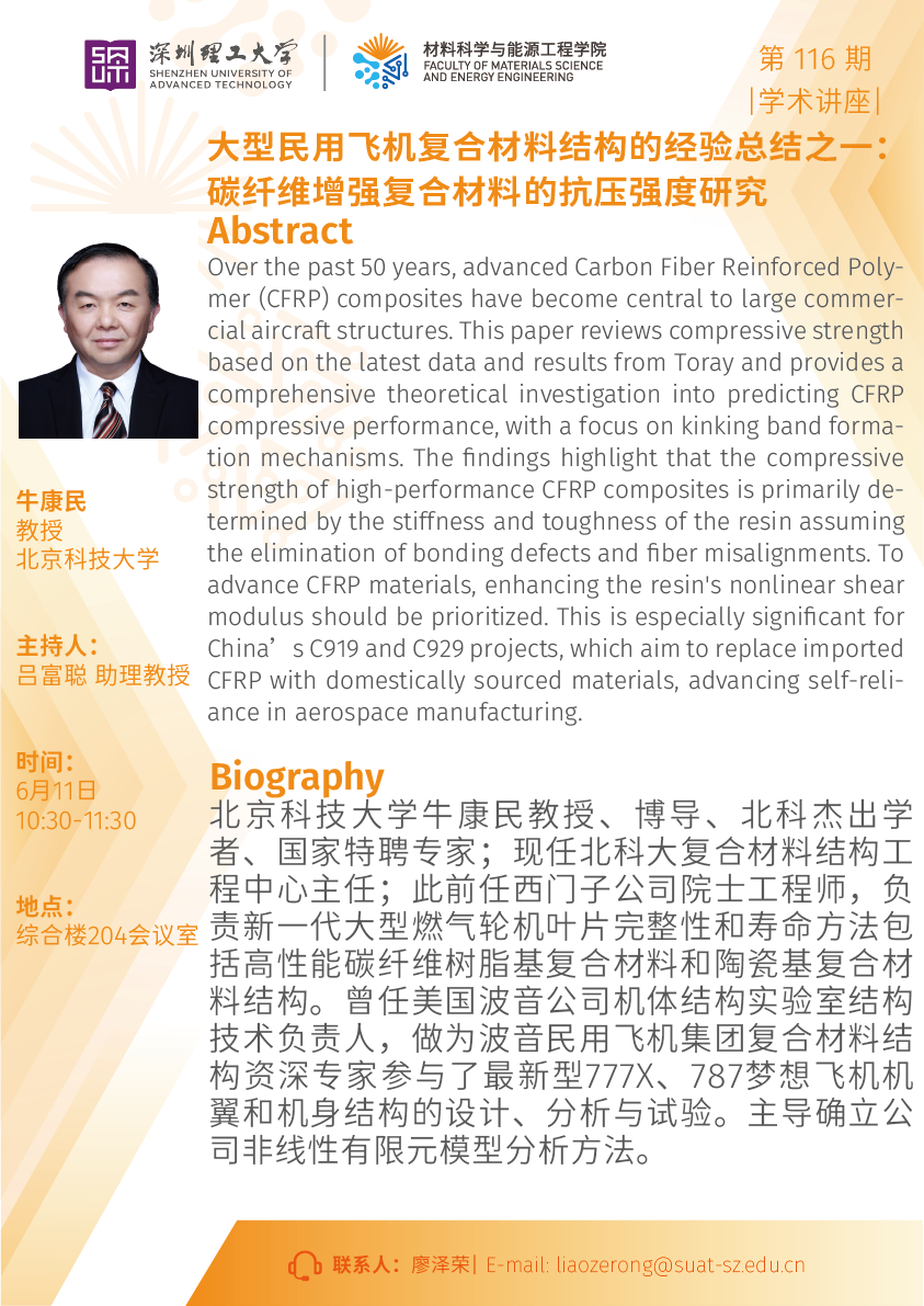 材料科學(xué)與能源工程學(xué)院--學(xué)術(shù)講座--大型民用飛機(jī)復(fù)合材料結(jié)構(gòu)的經(jīng)驗(yàn)總結(jié)之一:碳纖維增強(qiáng)復(fù)合材料的抗壓強(qiáng)度研究
