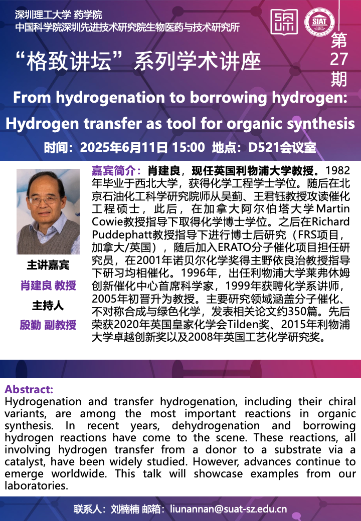 藥學(xué)院--格致講壇--From hydrogenation to borrowing hydrogen: Hydrogen transfer as tool for organic synthesi
