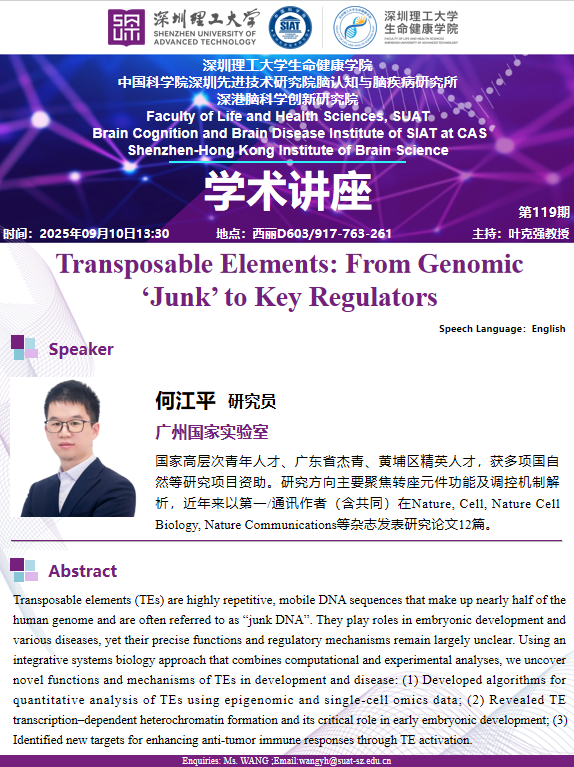 生命健康學(xué)院第119期學(xué)術(shù)講座《Transposable Elements: From Genomic ‘Junk’ to Key Regulators》
